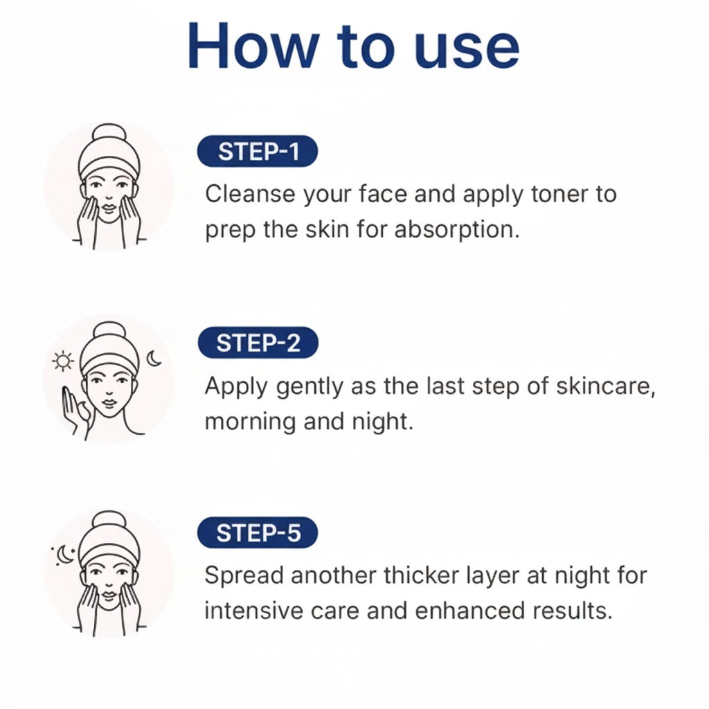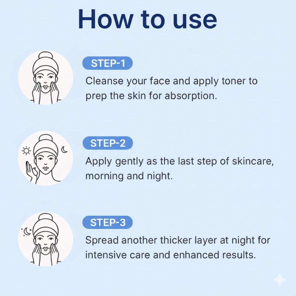 A pearl-sized amount is enough for the entire face. Thanks to its high absorption rate, overapplying isn’t necessary to see visible results.