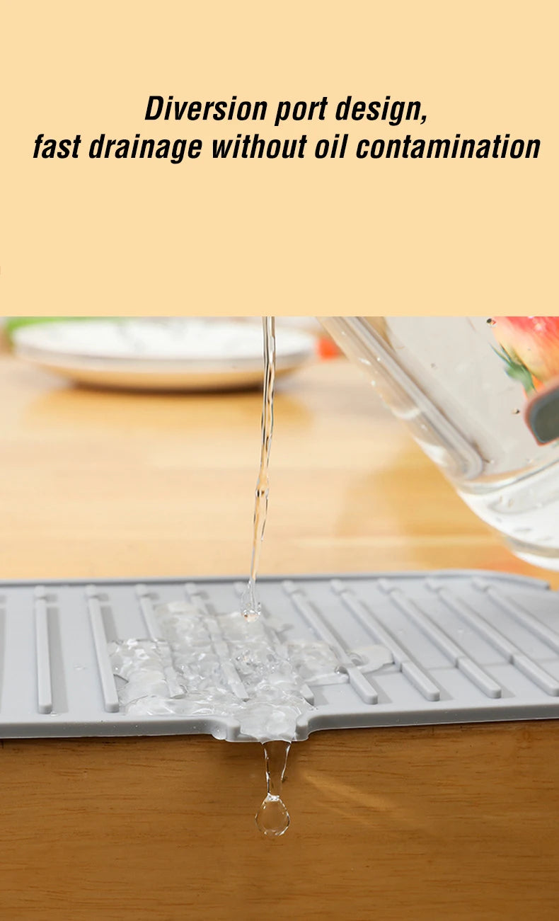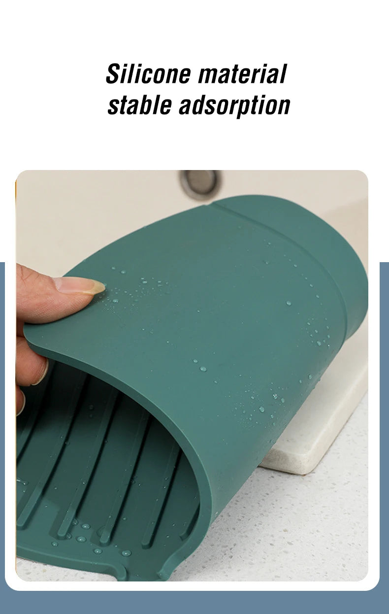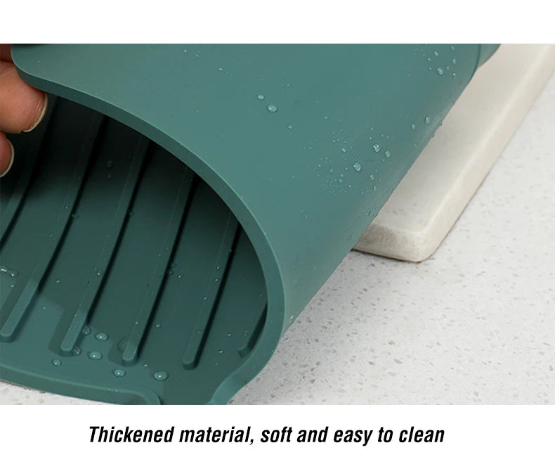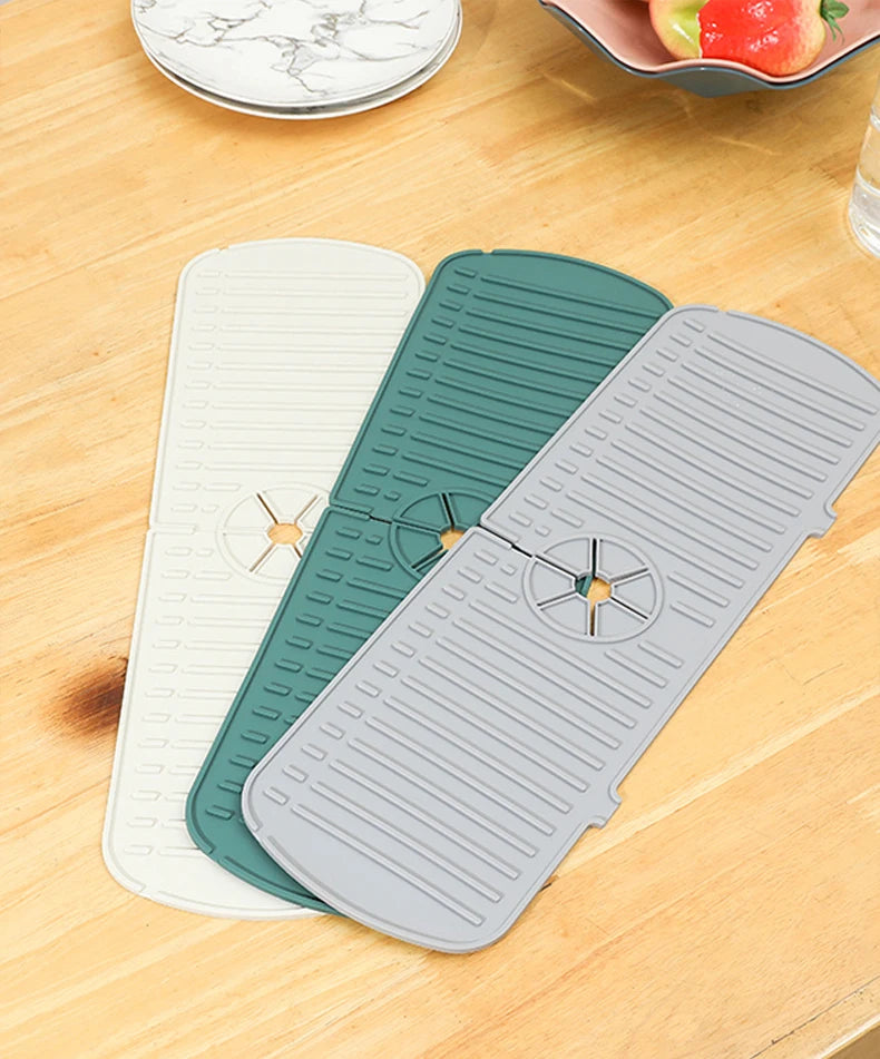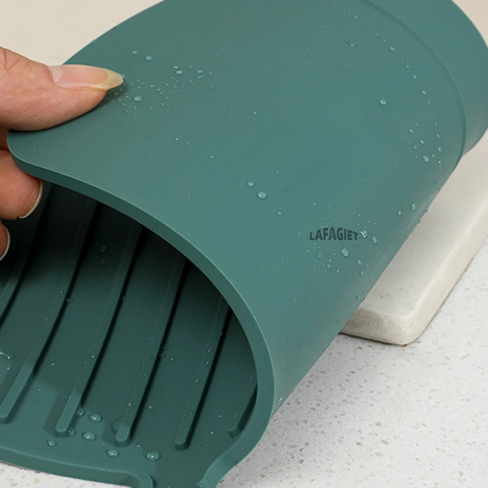 Say goodbye to puddles around your sink! This flexible silicone drip mat fits snugly around your faucet to catch water, soap, and splashes — keeping your countertop clean and dry. It doubles as a drying pad for sponges, brushes, and dishes, adding style and practicality to any kitchen or bathroom.